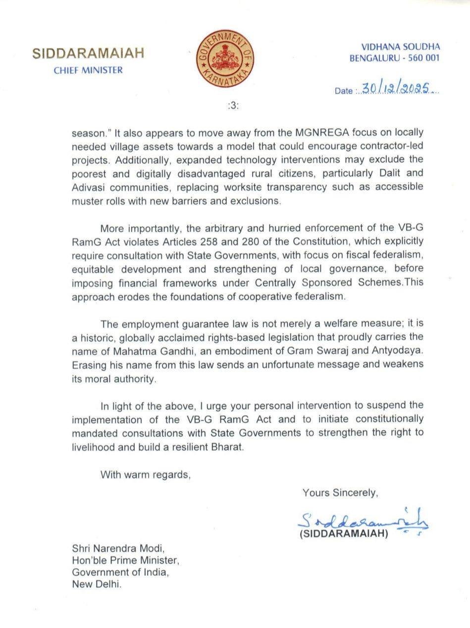 ಈ ಎಲ್ಲಾ ವಿಷಯಗಳನ್ನು ಗಮನದಲ್ಲಿಟ್ಟುಕೊಂಡು, ವಿಬಿ-ಜಿ ರಾಮ್ ಜಿ ಕಾಯ್ದೆಯ ಅನುಷ್ಠಾನವನ್ನು ತಡೆಹಿಡಿಯಲು, ಜೀವನೋಪಾಯದ ಹಕ್ಕನ್ನು ಬಲಪಡಿಸಲು ಮತ್ತು ಸಂವಿಧಾನಬದ್ಧವಾಗಿ ರಾಜ್ಯ ಸರ್ಕಾರಗಳೊಂದಿಗಿನ ಸಮಾಲೋಚನೆಗಳನ್ನು ನಡೆಸುವ ನಿಟ್ಟಿನಲ್ಲಿ ತಾವು ವೈಯಕ್ತಿಕವಾಗಿ ಮುಂದಾಗಬೇಕು ಎಂದು ಕೋರುತ್ತೇನೆ.