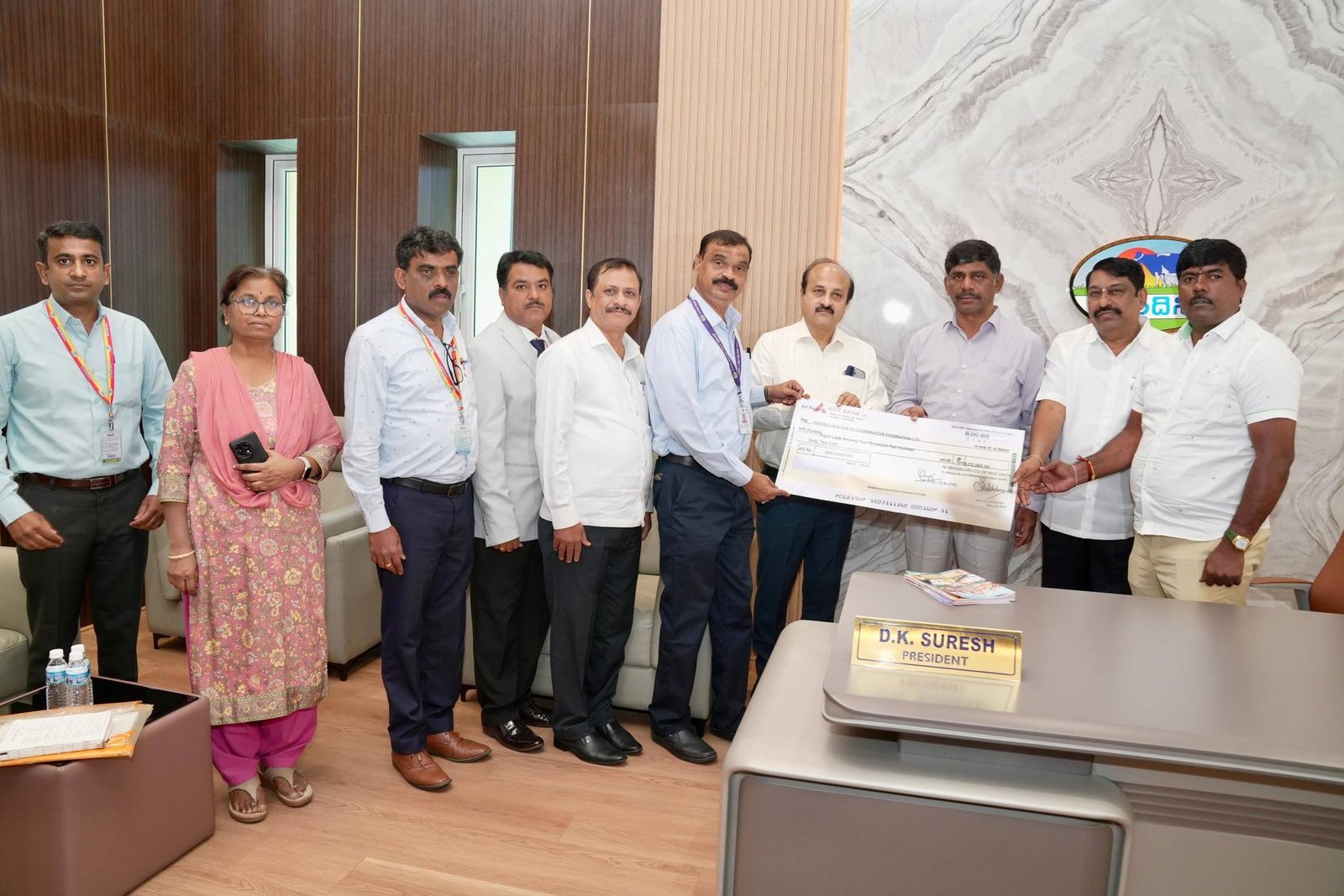 ಬಮೂಲ್ ಕೇಂದ್ರ ಕಚೇರಿಯಲ್ಲಿ ನಡೆದ ಸರಳ ಸಮಾರಂಭದಲ್ಲಿ, ಮಾಜಿ ಸಂಸದರು ಹಾಗೂ ಮುಖಂಡರಾದ ಶ್ರೀ ಡಿ.ಕೆ. ಸುರೇಶ್ ಅವರು ಕರ್ನಾಟಕ ರಾಜ್ಯ ಸಹಕಾರ ಮಹಾಮಂಡಳದ ವ್ಯವಸ್ಥಾಪಕ ನಿರ್ದೇಶಕರಾದ ಶ್ರೀ ಕೆ.ಎಸ್. ನವೀನ್ ಅವರಿಗೆ ಅಧಿಕೃತವಾಗಿ ಚೆಕ್ ಅನ್ನು ಹಸ್ತಾಂತರಿಸಿದರು.