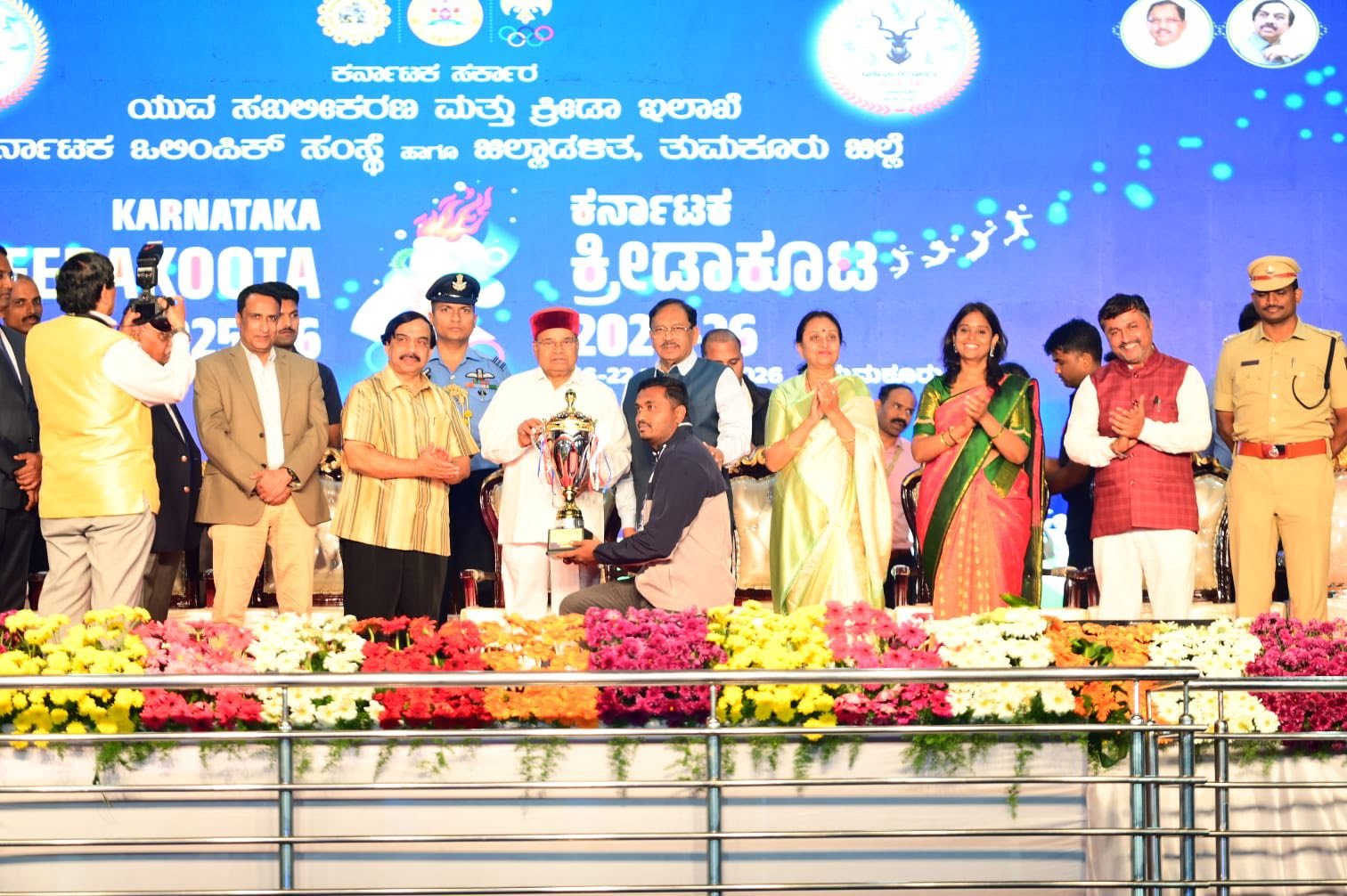 ತುಮಕೂರು: ಜಿಲ್ಲೆಯ ಕ್ರೀಡಾ ಇತಿಹಾಸದಲ್ಲಿ ಹೊಸ ಮೈಲಿಗಲ್ಲು ಸ್ಥಾಪಿಸಿರುವ ‘ಕರ್ನಾಟಕ ಕ್ರೀಡಾಕೂಟ 2025-26’ ಕ್ಕೆ ಇಂದು ಅದ್ಧೂರಿ ತೆರೆ ಬಿದ್ದಿದೆ. ಮಹಾತ್ಮ ಗಾಂಧಿ ಜಿಲ್ಲಾ ಕ್ರೀಡಾಂಗಣದಲ್ಲಿ ನಡೆದ ಸಮಾರೋಪ ಸಮಾರಂಭದಲ್ಲಿ ಘನತೆವೆತ್ತ ರಾಜ್ಯಪಾಲರಾದ ಥಾವರ್ ಚಂದ್ ಗೆಹ್ಲೋಟ್ ಹಾಗೂ ಗೃಹ ಸಚಿವರಾದ ಡಾ. ಜಿ. ಪರಮೇಶ್ವರ್ ಅವರು ವಿಜೇತ ಕ್ರೀಡಾಪಟುಗಳಿಗೆ ಪ್ರಶಸ್ತಿ ವಿತರಿಸಿ ಅಭಿನಂದಿಸಿದರು.