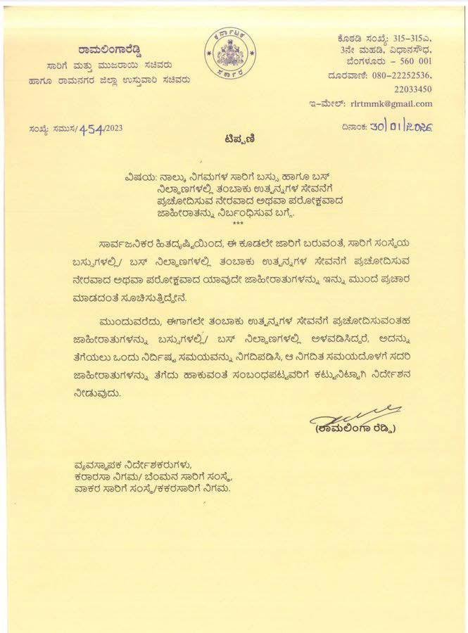 ಜಾಹೀರಾತುಗಳಿಗೆ ಬ್ರೇಕ್: ಸಾರಿಗೆ ಸಂಸ್ಥೆಯ ಬಸ್ಸುಗಳು ಮತ್ತು ನಿಲ್ದಾಣಗಳಲ್ಲಿ ತಂಬಾಕು ಉತ್ಪನ್ನಗಳನ್ನು ಉತ್ತೇಜಿಸುವ ಯಾವುದೇ ರೀತಿಯ ಜಾಹೀರಾತುಗಳ ಪ್ರಚಾರವನ್ನು ಸಂಪೂರ್ಣವಾಗಿ ನಿರ್ಬಂಧಿಸಲಾಗಿದೆ.