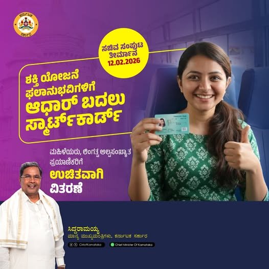 ಬೆಂಗಳೂರು: ರಾಜ್ಯ ಸರ್ಕಾರದ ಮಹತ್ವಾಕಾಂಕ್ಷೆಯ ‘ಶಕ್ತಿ’ ಯೋಜನೆಯಡಿ ಸರ್ಕಾರಿ ಬಸ್ಗಳಲ್ಲಿ ಉಚಿತವಾಗಿ ಪ್ರಯಾಣಿಸುವ ಮಹಿಳೆಯರು ಮತ್ತು ಲಿಂಗತ್ವ ಅಲ್ಪಸಂಖ್ಯಾತರಿಗೆ ಸರ್ಕಾರವು ಸಿಹಿ ಸುದ್ದಿಯೊಂದನ್ನು ನೀಡಿದೆ. ಇನ್ನು ಮುಂದೆ ಆಧಾರ್ ಕಾರ್ಡ್ ತೋರಿಸುವ ಬದಲಾಗಿ, ಅತ್ಯಾಧುನಿಕ ‘ಸ್ಮಾರ್ಟ್ಕಾರ್ಡ್’ ಮೂಲಕ ನಿಶ್ಚಿಂತೆಯಿಂದ ಪ್ರಯಾಣಿಸಲು ಸಚಿವ ಸಂಪುಟ ಸಭೆಯಲ್ಲಿ ಮಹತ್ವದ ತೀರ್ಮಾನ ಕೈಗೊಳ್ಳಲಾಗಿದೆ.