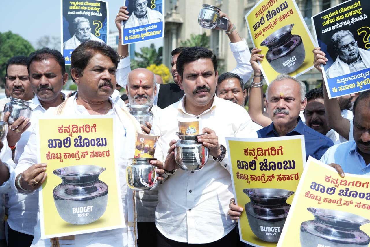 ಬೆಂಗಳೂರು: ಮುಖ್ಯಮಂತ್ರಿ ಸಿದ್ದರಾಮಯ್ಯನವರು ಮಂಡಿಸಿದ 2026-27ನೇ ಸಾಲಿನ ಬಜೆಟ್ ಅನ್ನು “ಜನವಿರೋಧಿ” ಮತ್ತು “ರಾಜ್ಯವನ್ನು ಸಾಲದ ಸುಳಿಗೆ ದೂಡುವ ಬಜೆಟ್” ಎಂದು ಬಣ್ಣಿಸಿರುವ ಬಿಜೆಪಿ, ಇಂದು ವಿಧಾನಸೌಧದ ಮುಂಭಾಗ ವಿಭಿನ್ನವಾಗಿ ಪ್ರತಿಭಟಿಸಿತು.