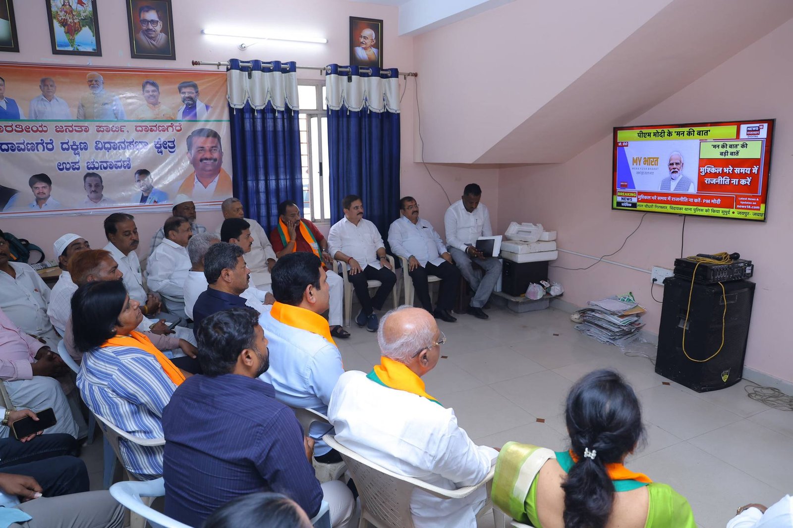 ದಾವಣಗೆರೆ: ಪ್ರಧಾನಮಂತ್ರಿ ನರೇಂದ್ರ ಮೋದಿ ಅವರ ಜನಪ್ರಿಯ ರೇಡಿಯೋ ಕಾರ್ಯಕ್ರಮ ‘ಮನ್ ಕಿ ಬಾತ್’ ಅನ್ನು ಇಂದು ದಾವಣಗೆರೆಯಲ್ಲಿ ಬಿಜೆಪಿ ರಾಜ್ಯಾಧ್ಯಕ್ಷ ಬಿ.ವೈ. ವಿಜಯೇಂದ್ರ ಅವರು ಪಕ್ಷದ ಹಿರಿಯ ನಾಯಕರು ಹಾಗೂ ಕಾರ್ಯಕರ್ತರೊಂದಿಗೆ ಕುಳಿತು ಆಲಿಸಿದರು.