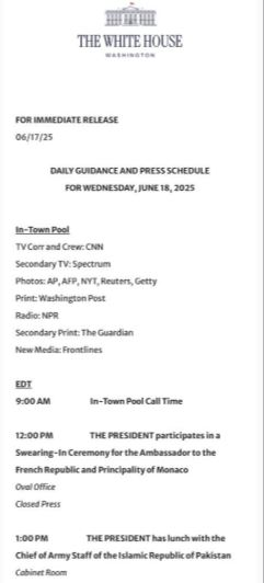 ಅಮೆರಿಕ ಪ್ರವಾಸದಲ್ಲಿರುವ ಫೀಲ್ಡ್ ಮಾರ್ಷಲ್ ಅಸಿಮ್ ಮುನೀರ್ ಜೂನ್ 18 ಬುಧವಾರ ಮಧ್ಯಾಹ್ನ 1 ಗಂಟೆಗೆ ಶ್ವೇತಭವನದ ಕ್ಯಾಬಿನೆಟ್ ಕೊಠಡಿಯಲ್ಲಿ ಡೊನಾಲ್ಡ್ ಟ್ರಂಪ್ ಅವರನ್ನು ಭೇಟಿಯಾಗಿ, ಭೇಟಿಯ ವೇಳೆ ಲಂಚವಿಷಯದ ಸಮಾಲೋಚನೆ ಮತ್ತು ರಾಜಕೀಯ ಮಾತುಕತೆ ನಡೆಯಲಿದೆ. ಇಬ್ಬರು ನಾಯಕರು ಮಧ್ಯಾಹ್ನ ಭೋಜನವನ್ನೂ ಹಂಚಿಕೊಳ್ಳಲಿದ್ದಾರೆ.